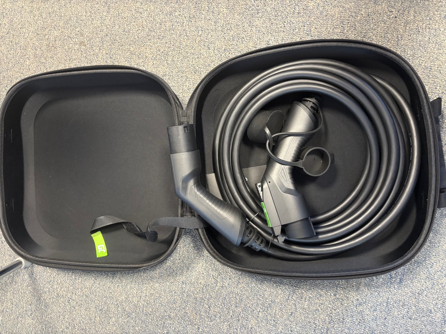 Gör din Typ 1 bil redo för publika Typ 2 laddare och laddboxar. Denna Green Cell kabel ger stabil AC laddning upp till 7,2 kW, är vatten- och dammtät (IP66) och kommer i en robust bärväska med skyddshuvor för båda kontakterna.
